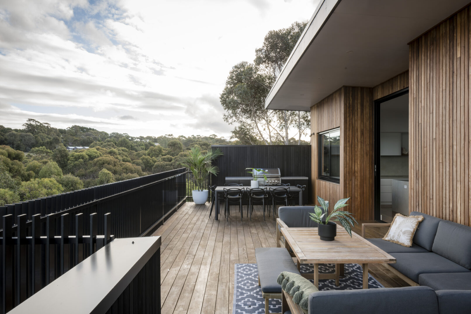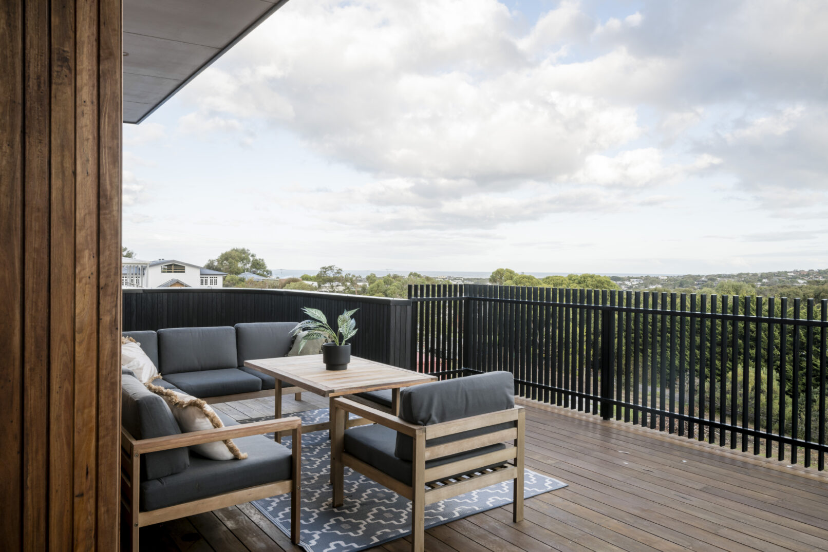 The rear of the site faces North but the views are to the South. A careful arrangement of the upper floor windows allowed for substantial solar harvesting on the North side and considered openings to the South to harvest ocean views. A wide deck sits on both sides to cater for both summer and winter situations. orientation at the side. All habitable rooms have a North-facing orientation except for one.