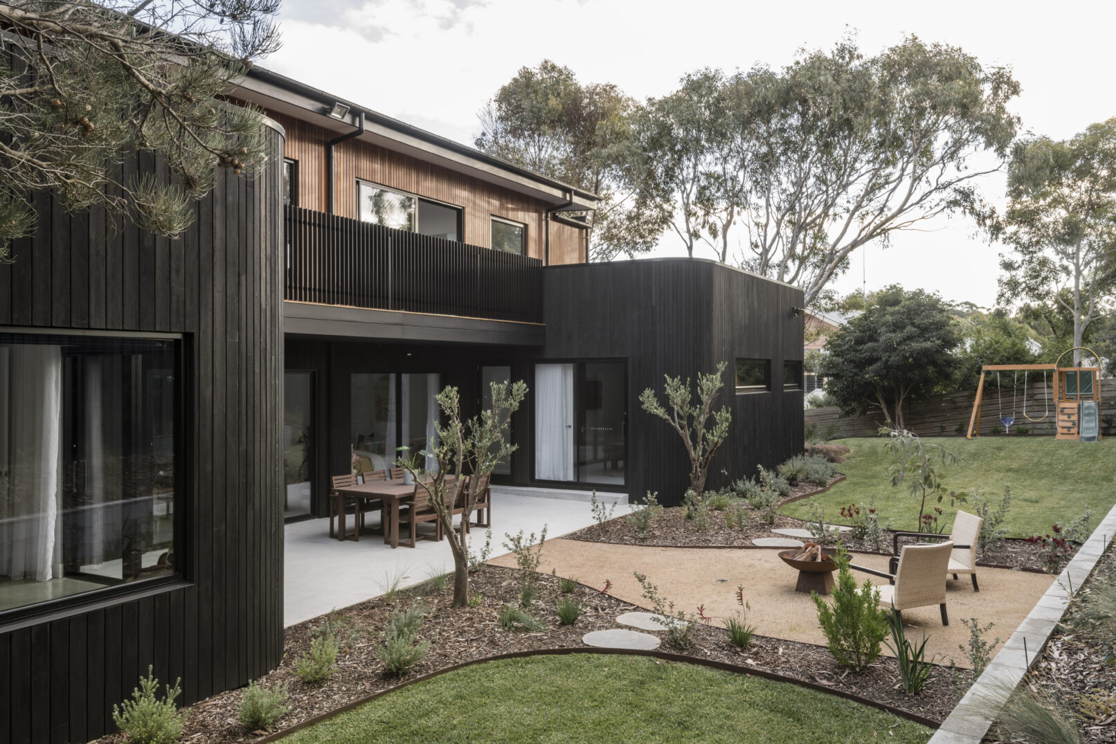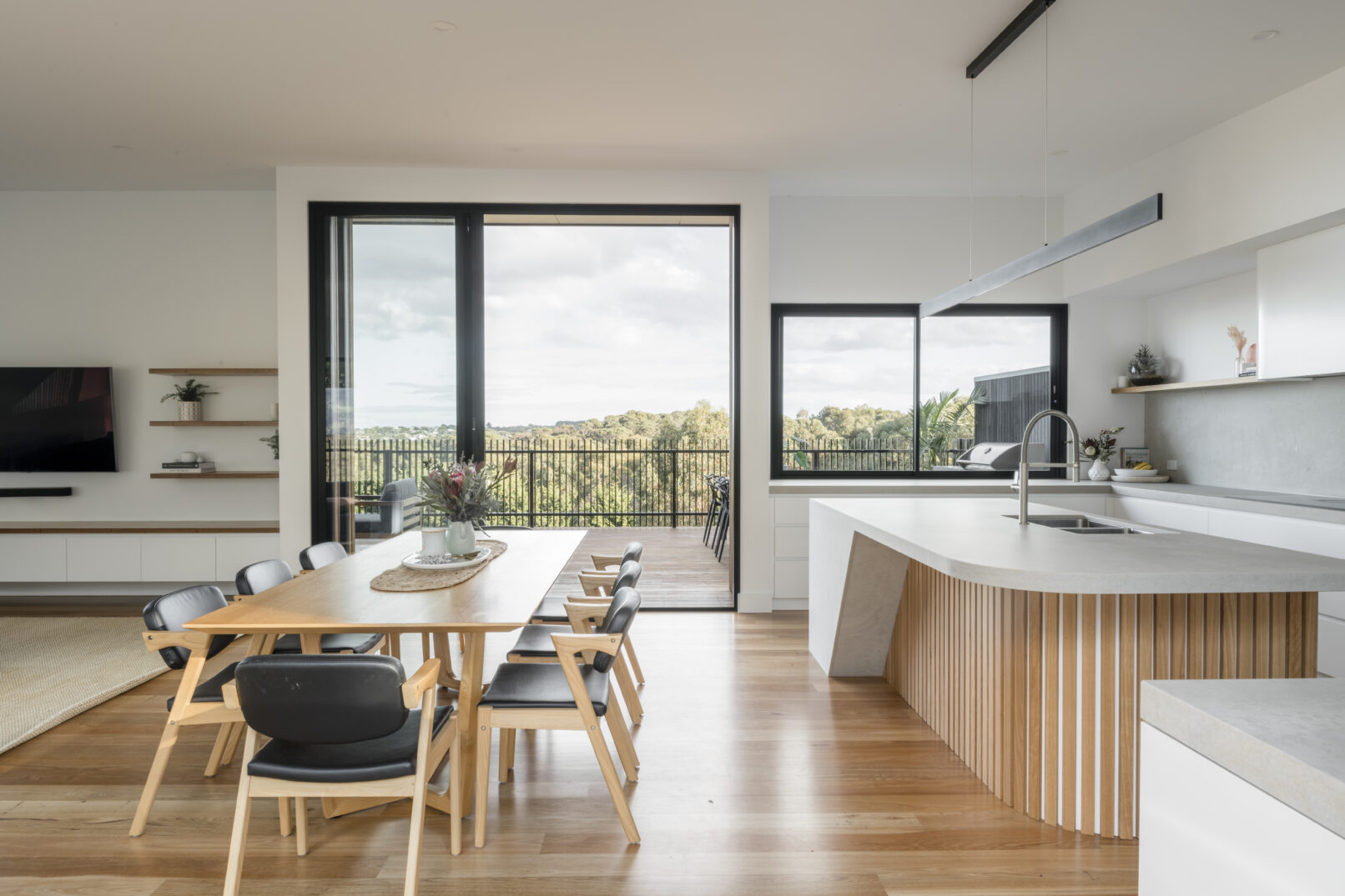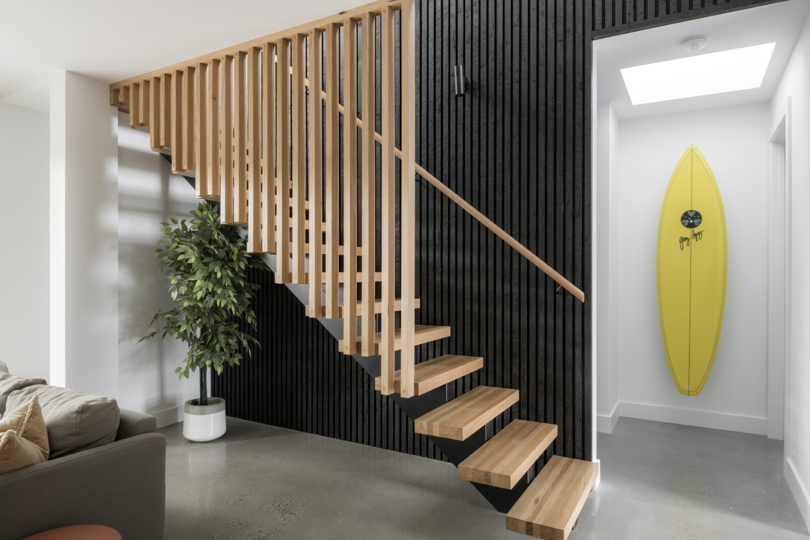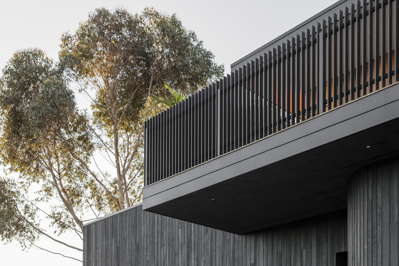 The four Bedrooms, Rumpus and three-car Garage are on the ground floor and living areas on the upper floor. The stairwell is directly opposite the ground floor entrance door to ensure a straight run to the Kitchen. Natural materials such as the charred Silvertop Ash cladding provide a striking and maintenance free finish.