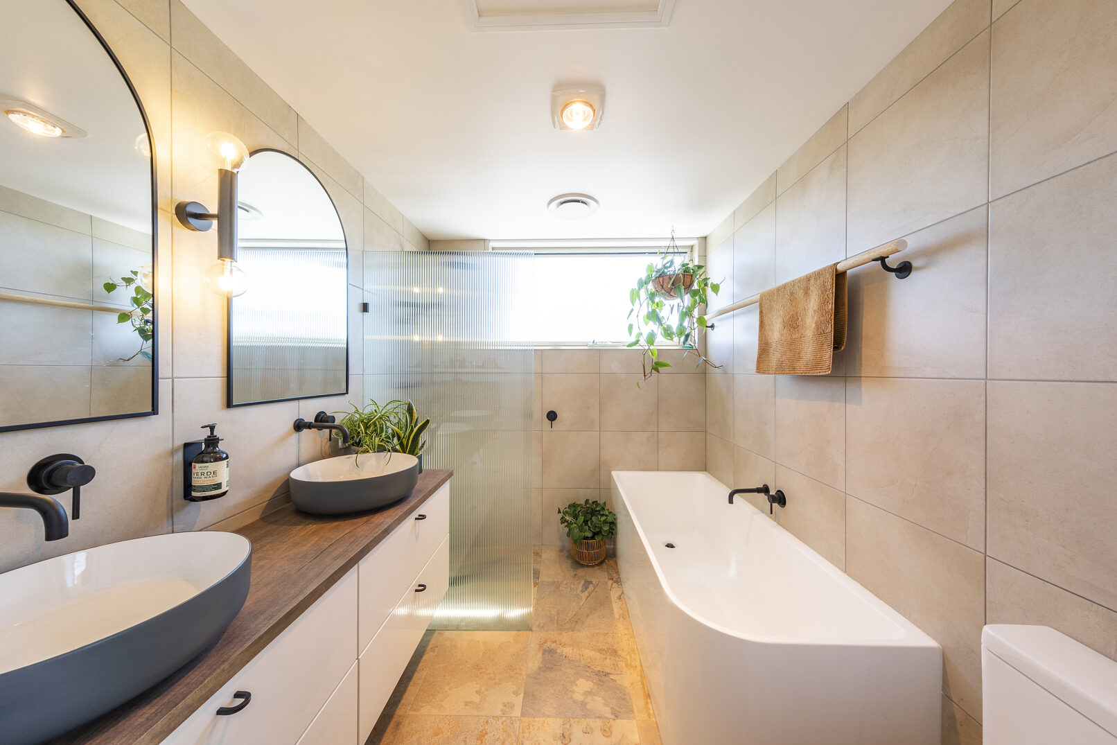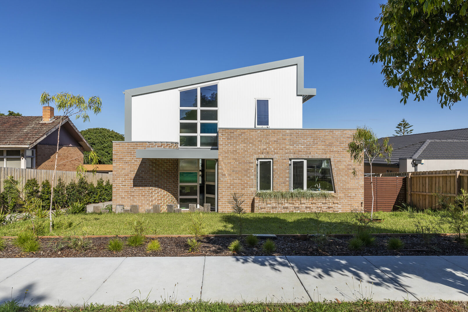 The sloping block was purchased to build two three-bedroom townhouses with rumpus and double-car garage. The owners’ intention was to live in the front house and rent out the rear one. Both homes were to be all-electric, highly energy-efficient and feature reverse-brick veneer walls, heat pumps and solar panels.