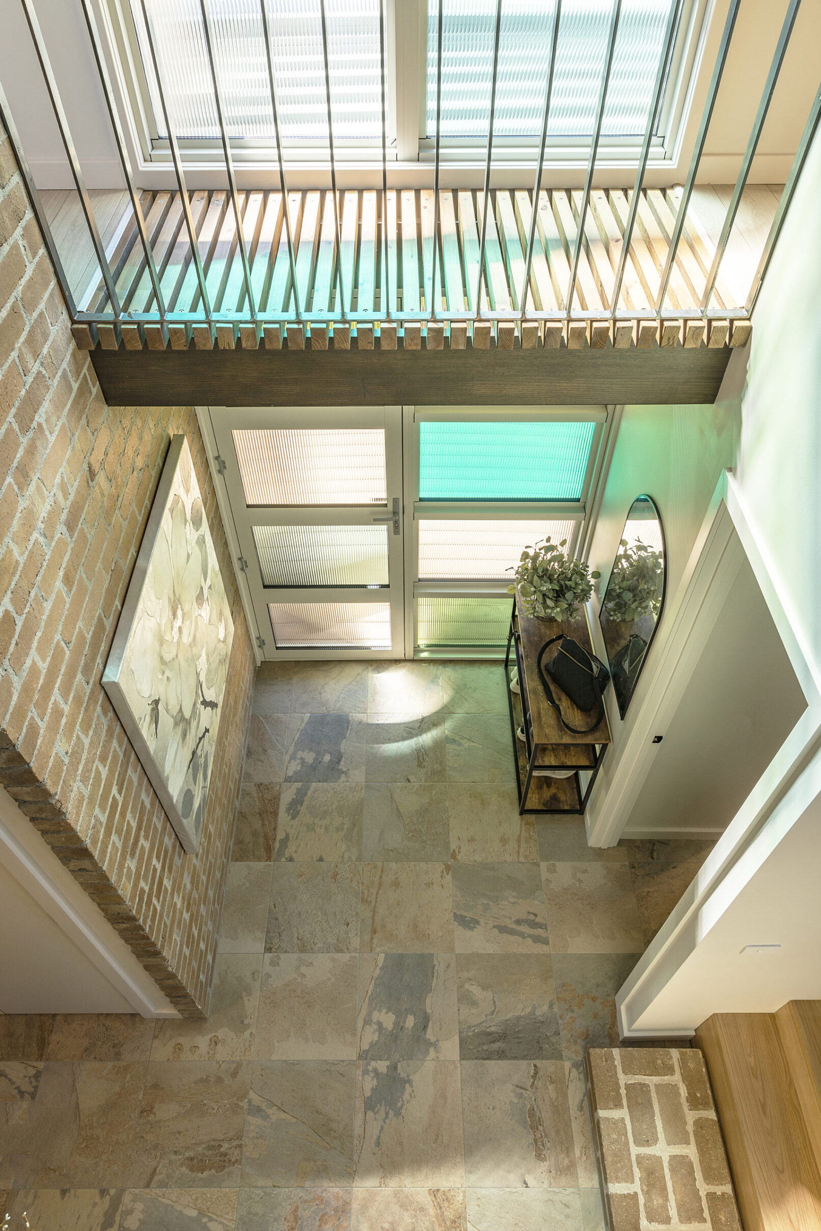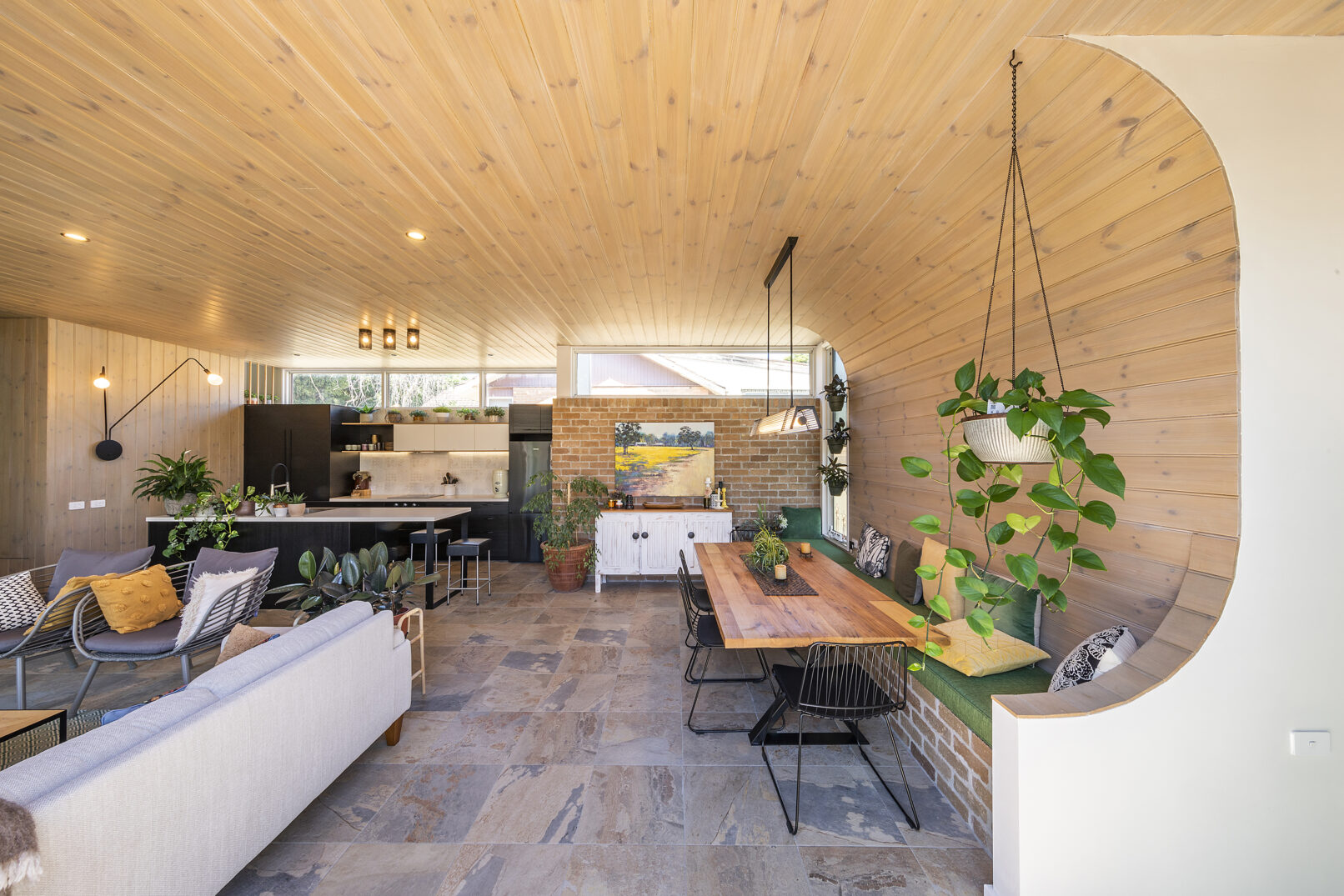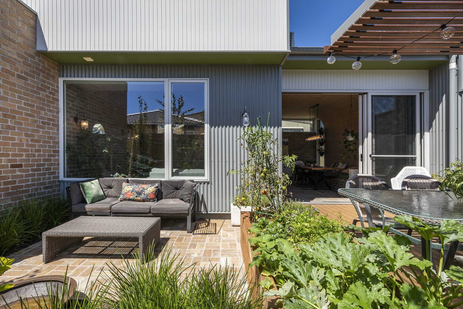 A split-level tiled concrete slab floor provides good thermal mass which is crucially insulated underneath. The internal brickwork adds to the thermal mass, the same way ice blocks would be placed in an esky – itself an insulated envelope, much like a house. Thermal mass naturally moderates both summer and winter indoor temperatures.